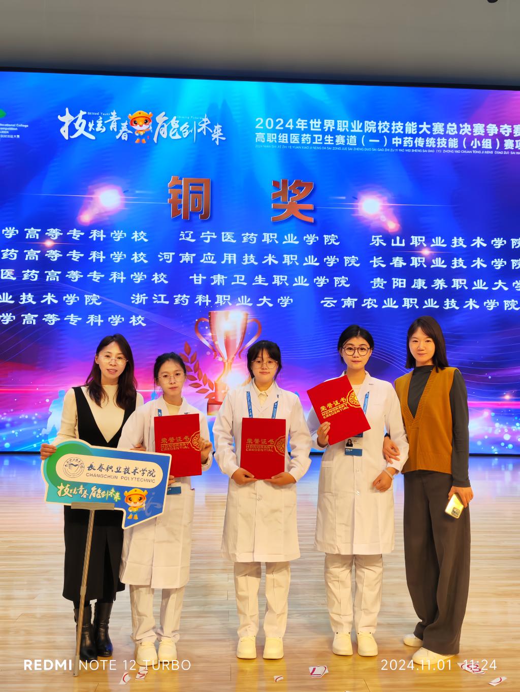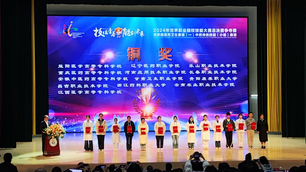 10月28至31日,2024年世界职业院校技能大赛中药传统技能(赛项)总决赛争夺赛在青海省卫生职业技术学院举行,来自全国30个省、自治区、直辖市的55支队伍参加了比赛。经过激烈的角逐,我院教师孙晓玲、王莹指导的学生董佳雪、郭思涵、宋浩然以603分的成绩荣获小组第三名,勇夺铜奖。