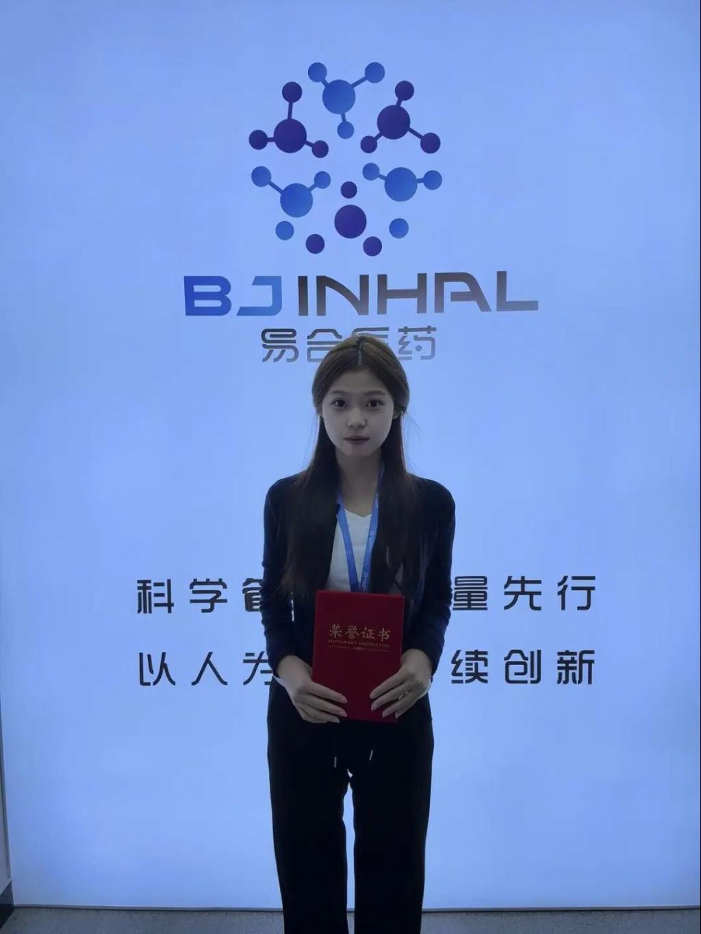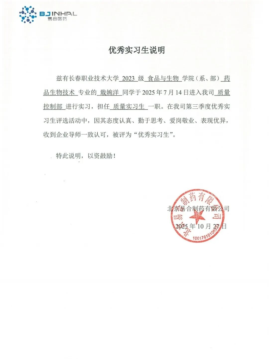 在实验室的严谨氛围中成长,在职场的实战舞台上闪光。近日,学院2023级药品生物技术专业学生戢婉洋,在北京易合制药有限公司实习期间表现突出,荣获企业第三季度“优秀实习生”称号,展现了学院学子扎实的专业素养与良好的职业风貌。