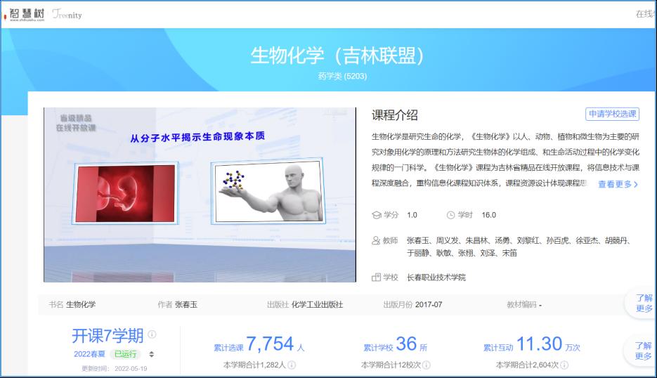 《生物化学》课程被评为职业教育国家在线精品课(2022)、吉林省职业教育精品在线开放课程(2020)。吉林省高等学校学历继续教育精品课(2024)、全国慕课十年典型案例(2023)、吉林省高校课程思政教学典范案例(2023)、智慧树杯课程思政示范案例特等奖(2022)、