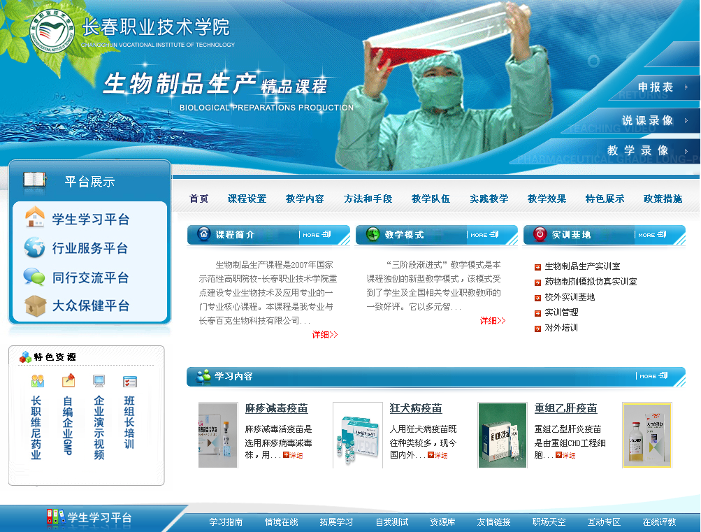 生物制品生产课程是我院与长春百克生物科技有限公司、长春生物制品研究所、长春亚泰生物制药有限公司等企业合作全程开发的以生物制品生产企业的职业能力、职业素质需求为依据,以工作过程为导向,以素质教育为基础,以学生为主体,突出职业能力目标,注重学生的可持续发展能力培养,以典型产品为载体,以行动导向教学为主要方法的理论实践一体化课程。